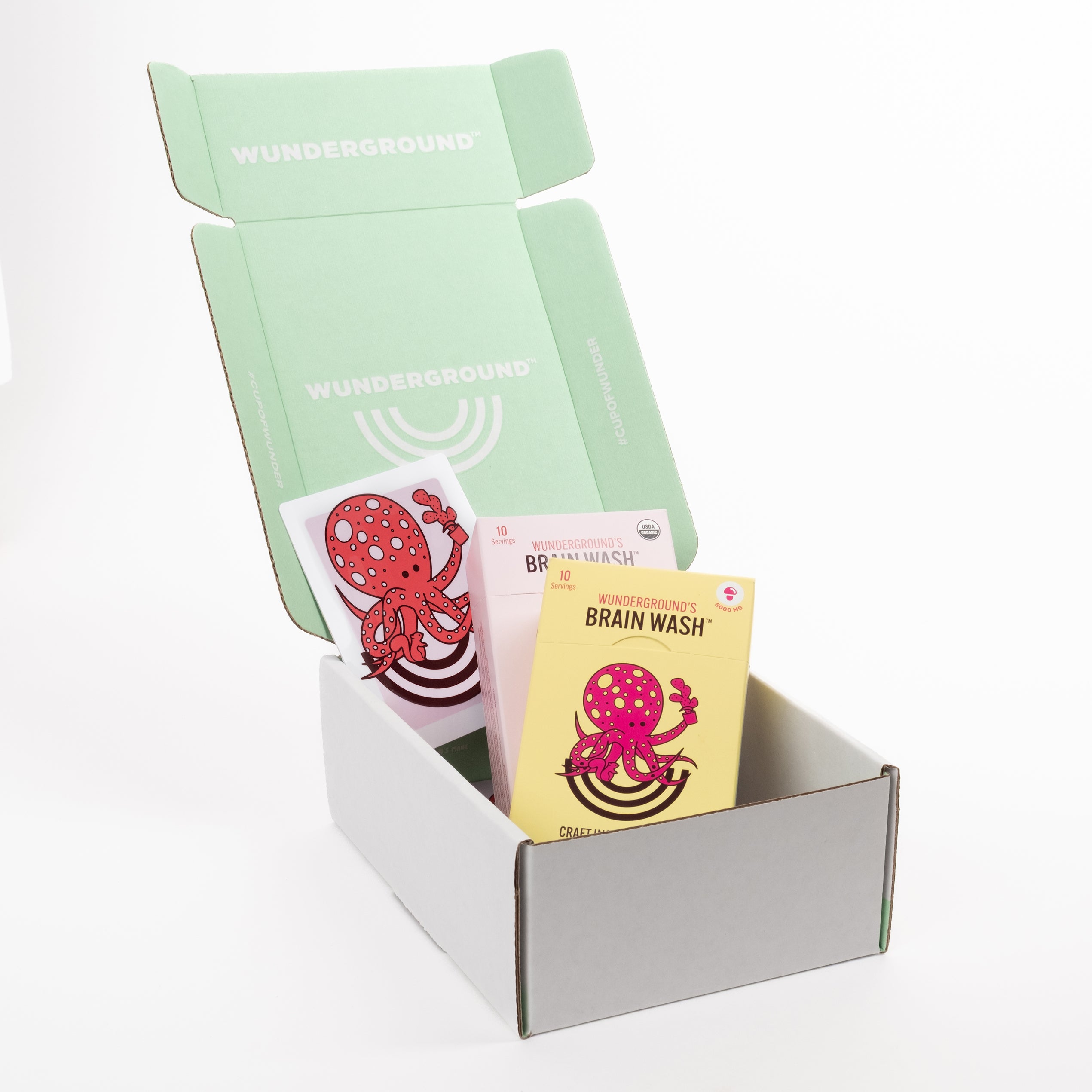 Wunderground's Brain Wash mushroom superboost packaging with a mug on a blue background